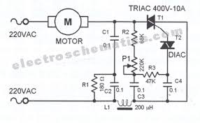 Power Management IC (PMIC) MOSFET and IGBT Gate Drivers AC Motor Speed Controller Circuit This triac-based 220V AC motor speed controller circuit is designed for controlling the speed of small household motors like drill machines. The speed of the motor can be controlled by changing the setting of P1. The setting of P1 determines the phase of the trigger pulse that fires the triac. The circuit incorporates a self-stabilizing technique that maintains the speed of the motor even when it is loaded. 220VAC Motor Speed Controller Schematic For example, when the motor of the drill machine is slowed down by the resistance of the drilled object, the counter-EMF of the motor also decreases. This results to a voltage increase in R2-P1 and C3 causing the triac to be triggered earlier and the speed increases accordingly. Related Products: Motors | Printed circuit board layout of the motor speed controller Another version found here. If the main use for this circuit is to control the brightness of a light bulb, RS and CS are not necessary.