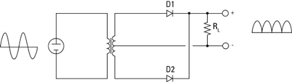 Half-wave rectifiers are simple enough to build but aren’t very efficient. That’s because the entire negative cycle of the AC input is blocked by a half-wave rectifier. As a result, output voltage is zero half of the time. This causes the average voltage at the output to be half of the input voltage. Note the resistor marked RL. This resistor isn’t actually a part of the rectifier circuit. Instead, it represents the resistance imposed by the load that will ultimately be placed on the circuit when the power supply is put to use. A full-wave rectifier uses two diodes, which enables it to pass both the positive and the negative side of the alternating current input. The diodes are connected to the transformer. Notice that the full-wave rectifier requires that you use a center-tapped transformer. The diodes are connected to the two outer taps, and the center tap is used as a common ground for the rectified DC voltage. The full-wave rectifier converts both halves of the AC sine wave to positive-voltage direct current.