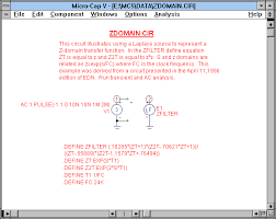 MC5 can run its equivalent Laplace transform though. With a Laplace function source, any z domain transfer functions may be converted to a Laplace transfer function through the substitution: One of the common uses of z transforms is to simulate discrete-time systems such as digital and switched capacitor filters. The following example is adapted from an article by B. Al-Hashimi and M. Moniri in the April 11, 1996 edition of EDN titled "Spice provides z-domain circuit simulation." This example simulates a third order, elliptic, lowpass switched-capacitor filter. This filter is represented by the following z domain transfer function. The figure below displays the MC5 equivalent circuit. The circuit contains two components. One is the SPICE independent source, V, that provides the input stimulus, and the other is a Laplace function VofV source which represents the switched capacitor filter. The V source is defined as a 1ms pulse with 10ns rise and fall times and a 2ms period for transient analysis.