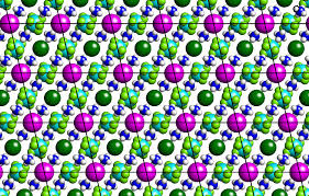 the positions of the dark-green coloured atoms had been chosen as lattice points. (Note the contrast to the reciprocal-space lattice used to identify diffraction spots which has a natural origin corresponding to the straight through X-ray beam.) In three-dimensional space, the equivalent repeat unit is a parallelepiped known as the unit cell as shown below: The translations in a 3-dimensional lattice may be described in terms of three linearly independent, i.e. non coplanar, vectors, The angles between the pairs of vectors and , and , and and are defined as , , and , respectively. The faces of the unit cell containing the pairs of vector and , and , and and are referred to as the A, B, and C faces, respectively. Considering again the "2-dimensional" crystal structure shown above, then the lattice points may be drawn as small purple dots as shown below, based on the purple balls in the figure above: The question arises as to the choice of parallelogram for our two-dimensional