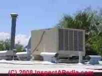 Rooftop HVAC equipment: this article describes rooftop mounted HVAC systems - rooftop air conditioners, rooftop heat pumps, and rooftop heating equipment. We describe types of roof-mounted HVAC equipment and common inspection points, operating problems, and repair approaches. At page top is a roof mounted swamp cooler or evaporative cooling system on a private home in Tucson. Rooftop mounted central air conditioning systems may include both the cooling unit (evaporator coil, blower fan, filters) and the compressor/condenser unit in one package. At above right is a complex of roof-mounted AC/heat pump systems on a Christchurch, New Zealand high rise building roof. These units may be a bit crowded as well as blown-on by the building's ventilation system openings at the upper right of the image. At above left is a flat-roof mounted commercial cooling system located in New York. Rooftop mounted central cooling systems may be smaller packaged systems which blow their cool air down directly into the cooled space through an opening in the roof, drawing return air from a nearby location, or