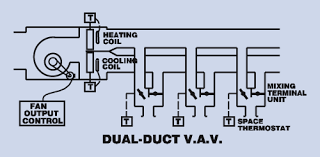 The main difference is a third duct that carries unconditioned air (a mixture of return air and outside air) for mixing with either the heated air or the chilled air. If properly installed, triple-duct systems have no mixing losses, except for leakage that occurs inside the terminal units. Here are the energy conservation measures for optimizing efficiency in VAV dual-duct systems. The largest opportunity for energy conservation in VAV double duct systems is eliminating any mixing of heated air and chilled air. Also, you can save fan energy by using accurate fan modulation to follow the cooling or heating loads. Variable-speed fans are the favored approach. VAV systems also allow you to use energy saving thermostatic controls, including deadband thermostats and temperature setback thermostats. The dual-duct VAV system design is especially favorable for exploiting the energy saving principle of the outside air economizer cycle. Find the details here.Handbook of Air Conditioning and Refrigeration, 2/e