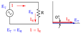 Direct current (DC) circuits involve current flowing in one direction. In alternating current (AC) circuits, instead of a constant voltage supplied by a battery, the voltage oscillates in a sine wave pattern, varying with time as: In a household circuit, the frequency is 60 Hz. The angular frequency is related to the frequency, f, by: Vo represents the maximum voltage, which in a household circuit in North America is about 170 volts. We talk of a household voltage of 120 volts, though; this number is a kind of average value of the voltage. The particular averaging method used is something called root mean square (square the voltage to make everything positive, find the average, take the square root), or rms. Voltages and currents for AC circuits are generally expressed as rms values. For a sine wave, the relationship between the peak and the rms average is: rms value = 0.707 peak value The relationship V = IR applies for resistors in an AC circuit, so In AC circuits we'll talk a lot about the phase of the current relative to the voltage.