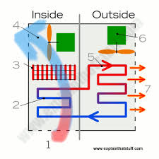 process lowers the humidity on the inside. This condensation principle is also Refrigerators work on the same principle, the red portion of the coils run up the outside rear of the refrigerator and the blue portion of the coils run inside the insulated walls of the fridge. To cool down the freezer portion of the fridge cooler than the rest of the fridge, more coils are run in that area than thru other parts of the refrigerator. This is all a basic description of how air conditioners work, in real life, thermostats are added to set desired temperature, protection devices to protect the compressor from overheating. If inadequate or obstructed air vents on the air conditioner can cause the unit to severely ice up to the point where air flow is blocked. shut down the unit and let the unit defrost completely, sometimes you can select to have the fan to run (without running the compressor) to speed the defrost Once defrosted, ensure that no blockage of air flow exists.