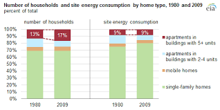 Republished: July 15, 2013: To correct an error in the text. Thirty percent of new home starts in 2012 were in apartment buildings with five or more units, the highest percentage since 1986 and up sharply from 18% in 2009 and 2010, according to the U.S. Census Bureau. About 17% of households (19 million) lived in apartment buildings with five or more units in 2009, up from 13% (11 million) in 1980, but they only accounted for 9% of home energy use in both years. Over the same period, single-family homes maintained a steady share of total households, but their share of total home energy use went up. Apartments in smaller buildings have declined as a share of both households and energy use, and mobile homes remain a small segment of the residential sector. Households in apartment buildings with five or more units use much less energy than the average for all households, and those in newer units use even less energy than those in older ones. As recent new construction joins the housing stock and older buildings fall out, energy use per household in large apartment buildings likely will continue to decline.