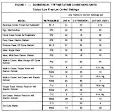 3. Desired compressor “on” time 4. The DP in the suction line between the evaporator and the LPC connection at the compressor. What all this means is that one picks cut-in and cut-out settings that should result in good temperature control, monitors the system, and then fine-tunes each specific job to achieve the desired results. shows the usual starting set points to set up a LPC for various applications. (R-134A can be substituted for R-12 and R-404A for R-502). Highest box temperature desired 36°F 36°F R-134A is 31 psig Set the cut-in at 31 psi 36°F minus 10°F is 26°F R-134A at 26°F is 23 psig Allow 2 - 3 psi for suction line DP 23 psig minus 3 psig = 20 psig 31 psia minus 20 psi = 11 psi Set the differential at 11 psi. The compressor will now go on at 33 psi and go off at 20-psi suction pressure. This should result in a box temperature of 34°F to 36°F. Depending on how well the system balance was made, that is, matching the evaporator to the compressor capacity at the selected suction temperature, the compressor run time will be long enough to give good efficiency and not short cycle.