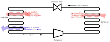 Remove heat from an enclosed region. Refrigerant, compressor, expansion valve (flow control device), evaporator, condenser, pipes and tubes. EXPLANATION OF HOW IT WORKS/ IS USED: Refrigerant flows through the compressor, which raises the pressure ofNext the refrigerant flows through the condenser, where it condenses from vapor form to liquid form, giving off heat in the process. The heat given off is what makes the condenser "hot to the touch." After the condenser, the refrigerant goes through the expansion valve, where it experiences a pressure drop. refrigerant goes to the evaporator. The refrigerant draws heat from the evaporator which causes the regrigerant to vaporize. The evaporator draws heat from the region that is toThe vaporized refrigerant goes back to the compressor to restart the cycle. Compressor: Of the reciprocating, rotary, and centrifugal compressors, the most popular among domestic or smaller power commercial