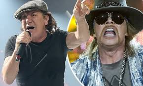Rumours circulated for several weeks that Axl, 54, would be joining AC/DC as touring singer amid concerns Brian risked total deafness if he played more stadium gigs. Out with the old, in with the new: Brian (left) will be replaced for the US and European dates of AC/DC's Rock or Bust tour with Guns N' Roses singer Axl Rose (right) Last month Axl, was spotted leaving the band's rehearsal space in Atlanta, Georgia - as local news outlets claimed he was also seen in the city when the band were auditioning potential singers.He was confirmed as touring singer on AC/DC's official website last week, as the band thanked Brian 'for his contributions and dedication to the band throughout the years'. The statement continued: 'We wish him all the best with his hearing issues and future ventures.'As much as we want this tour to end as it started, we understand, respect and support Brian's decision to stop touring and save his hearing. Long serving singer: English-born Brian - pictured here performing alongside guitarist Angus Young (right) with AC/DC recently - joined the Australian rock band in 1980 following the death of original frontman Bon Scott'We are dedicated to fulfilling the remainder of our touring commitments to everyone that has supported us over the years, and are fortunate that Axl Rose has kindly offered his support to help us fulfill this commitment'Meanwhile