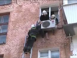 “Who wants a freak accident?” “Do the right thing and follow protocol.”Ukrainian grandmother Angela Artyomova clasps an air-conditioning unit outside her flat for dear life as she waits for help to arrive. The 97-year-old was left hanging 35ft above street level, suspended from the fourth floor, after she toppled while cleaning windows. The spritely pensioner managed to grab hold of an air conditioning unit at her flat in the city of Rivne after the fall, and then get her foot wedged in the bracket holding it in place. Her terrified calls for help were enough to alert passers by who called firefighters, and she was still hanging on by the time firefighters arrived and rushed to get a ladder underneath her to help her back inside. Fire brigade officials said they had realised the situation was desperate when they arrived and had no time to set up an air cushion. They used a ladder to speedily get to the OAP - who had been hanging for at least 30 minutes before she was helped back inside.